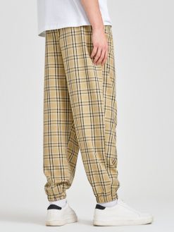 Mens Plaid Preppy Loose Fit Cuffed Pants With Pocket