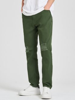 Mens Solid Color Ripped Daily Zipper Fly Jeans With Pocket