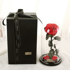 Para Ella Preserved Fresh Rose Flower with Fallen Petals in Glass Dome on Wooden Base